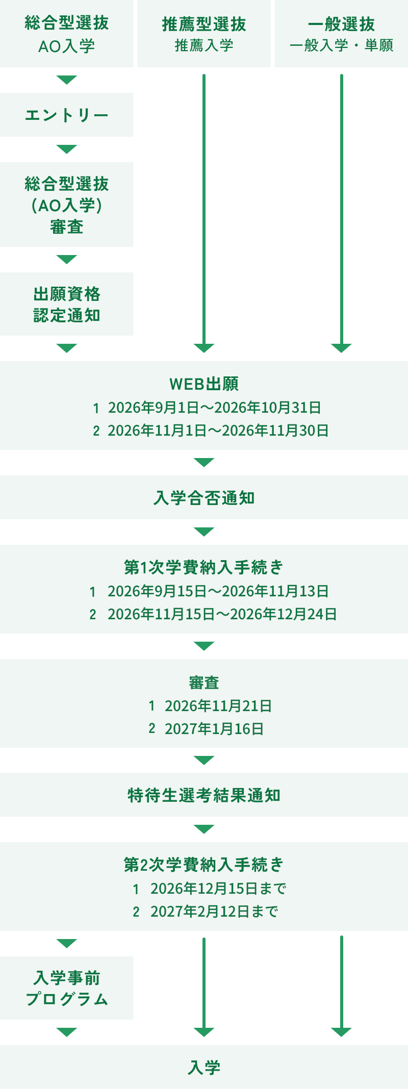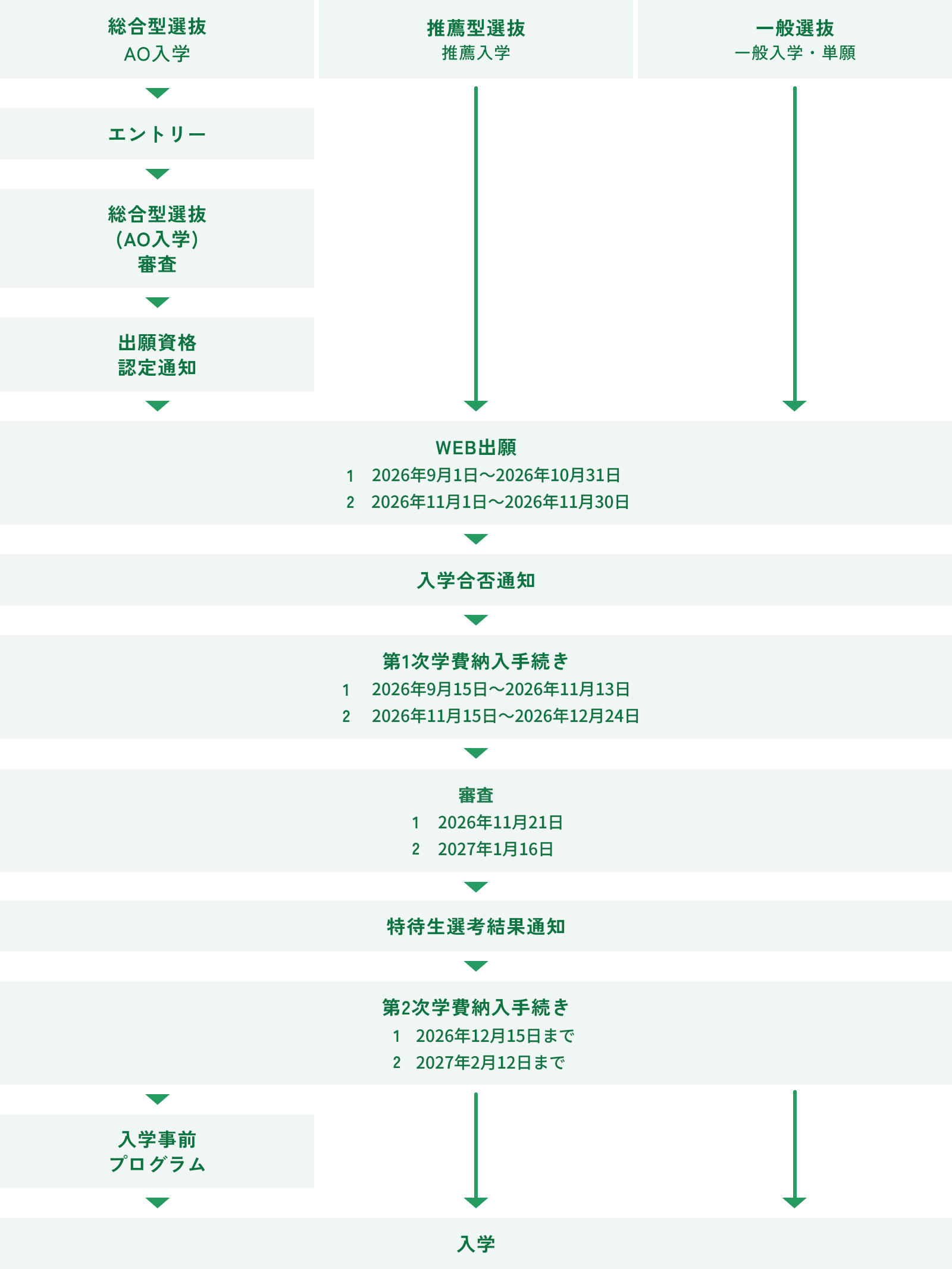 | 結果発表 | 2027年10月10日(学校ホームページにて発表)その後随時郵送で連絡します。 ※選考状況により、発表日が前後する場合がございます。 |