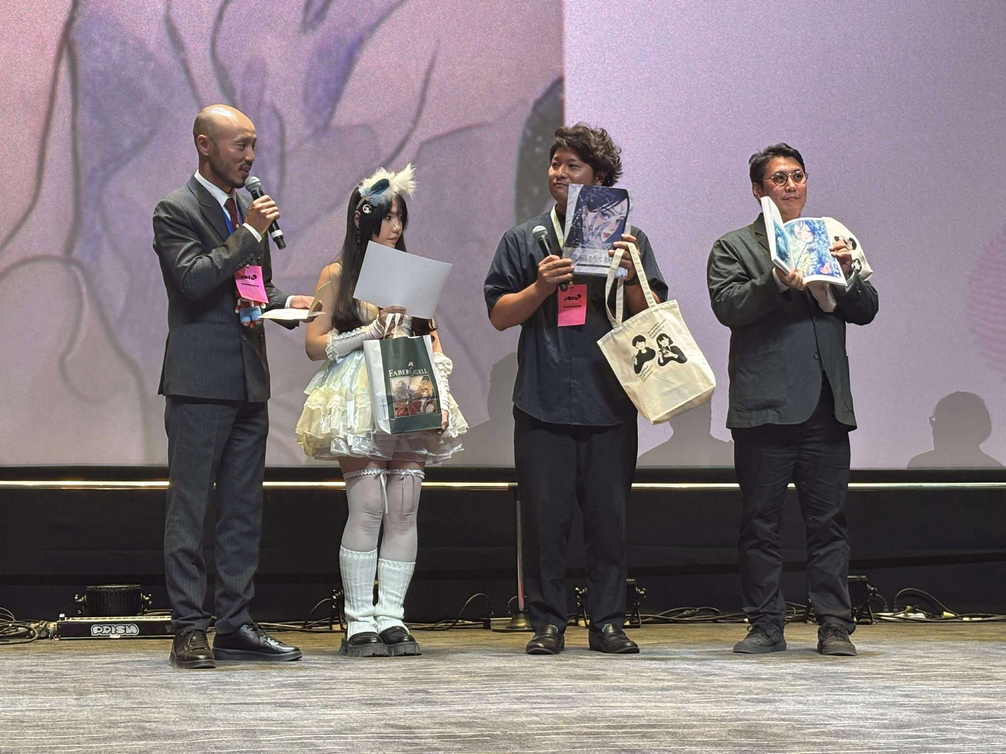 最後のプログラムとして、このイベントの中で実施されたイラストコンテストの表彰式に参加。上位賞にはNDSより記念品として、卒業生で水彩画家として活躍中の『芦屋マキさん』『夏目レモンさん』の画集を贈らせていただきました。