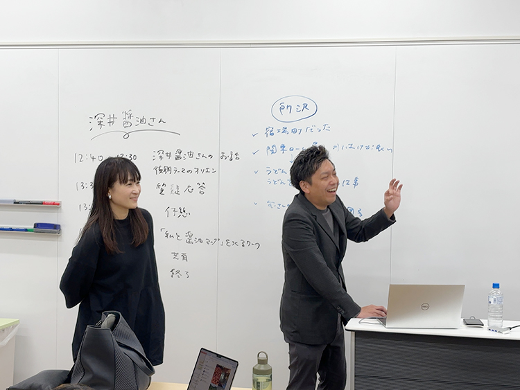 授業の後半では、お聞きした内容を基に学生たちはグループに分かれ、自分たちと醤油の関わりについてまとめる「私と醬油マップ」の制作を行いました。実際に試食をして感じた内容や深井さんからお聞きした情報を基にしたグループ制作は大盛り上がりでした。