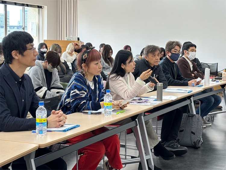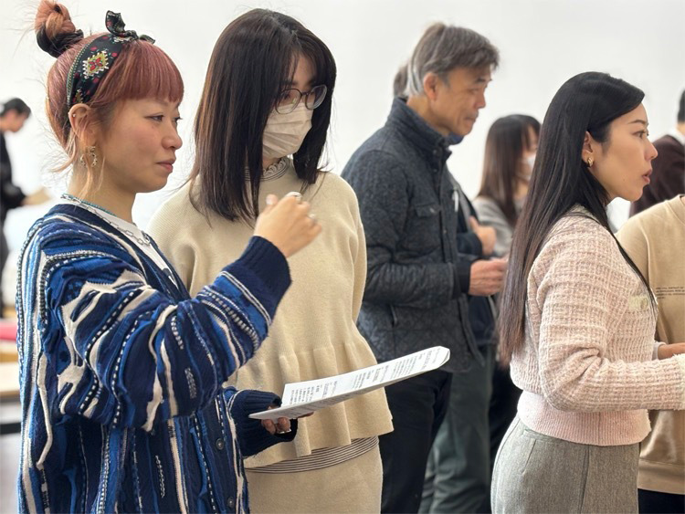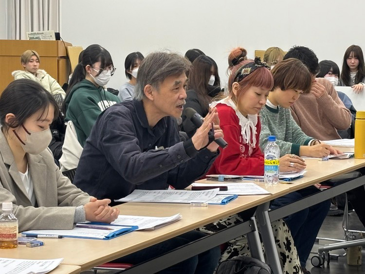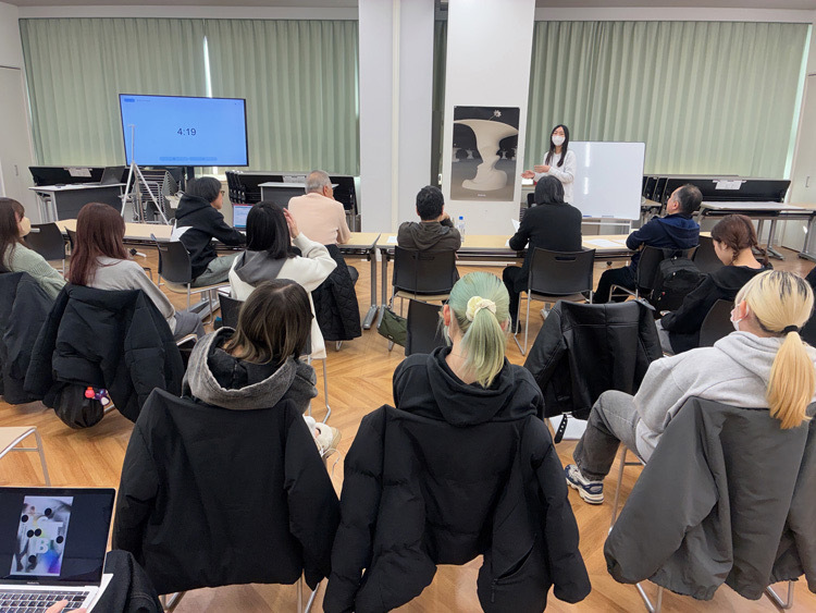 審査では、学生が時間をかけて作り上げた作品をその場で先生方に見ていただき、コメントやアドバイスをいただきます。1年生にとっては前期に続き2回目の審査になりますが、先生方とクラス全員の前での発表はまだまだ緊張が残る様子でした。